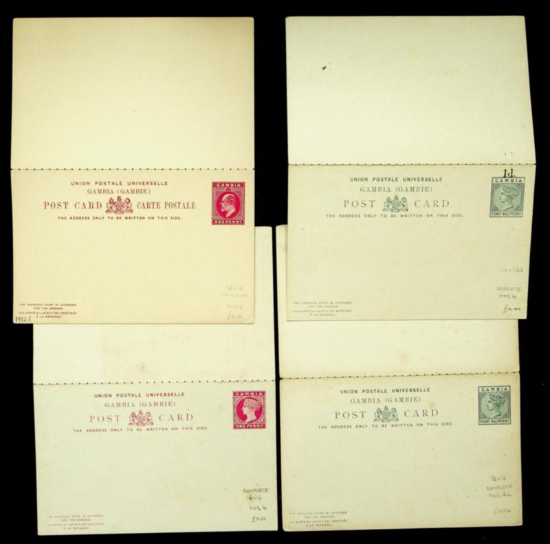 Gambia group of 4 different KED & QV unused UPU postcards with reply (Image)