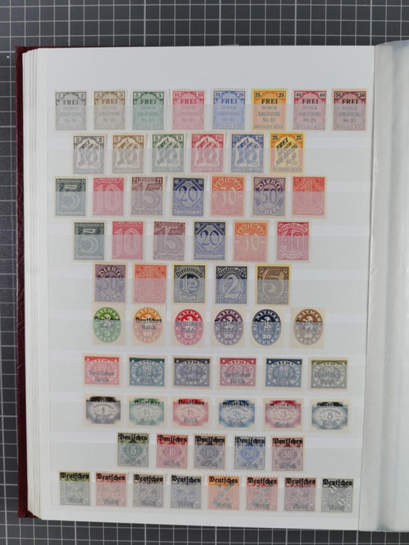 1872/1945, in den Hauptnummern augenscheinlich komplette ungebrauchte/postfrische und gestempelte Sammlung inkl. Block 1-11 und Dienstmarken, dabei neun Zeppelinbriefe und -karten, Mi.-Nr. 8 sign. Sommer BPP, 11 sign. Sommer BPP, 14 Briefstück (Befund Hennies BPP), 24 (FB Sommer BPP), 27b (Befund Hennies), sowie einige postfrische Brustschilde, 97Ia sign. Dr. Hochstädter BPP, Flugpost I-V, VI postfrisch (sign. Rohr), 423-24 sowie 455 gestempelt sowie die Mi. 423, 424, Südamerikafahrt und Polarfahrt je als Einzelfrankatur auf Karte bzw. Brief, ferner Bl. 1 (Herzstück postfrisch), Bl. 2 (Herzstück postfrisch), Chicagofahrt gestempelt (sign. Schlegel BPP), Bl. 3 gestempelt, 600-02 auf R-Brief mit Olympia-Maschinenstempel "Leipzig C2 / Garmisch - Partenkirchen” und Einlieferungsschein, Dienstmarken Mi. 1-14 ungebraucht, etc., anfangs leicht unterschiedliche, sonst gute Erhaltung, im Vordruckalbum
