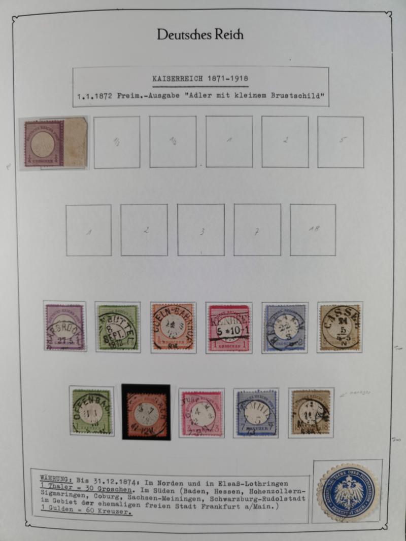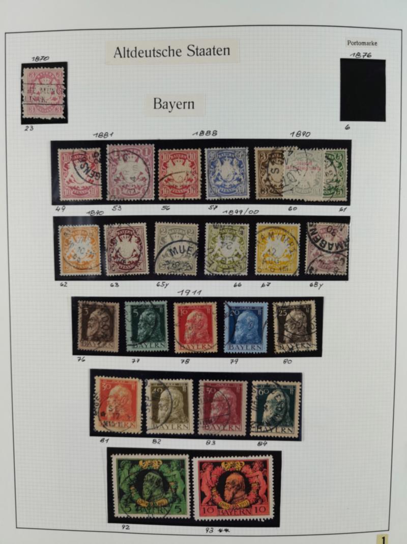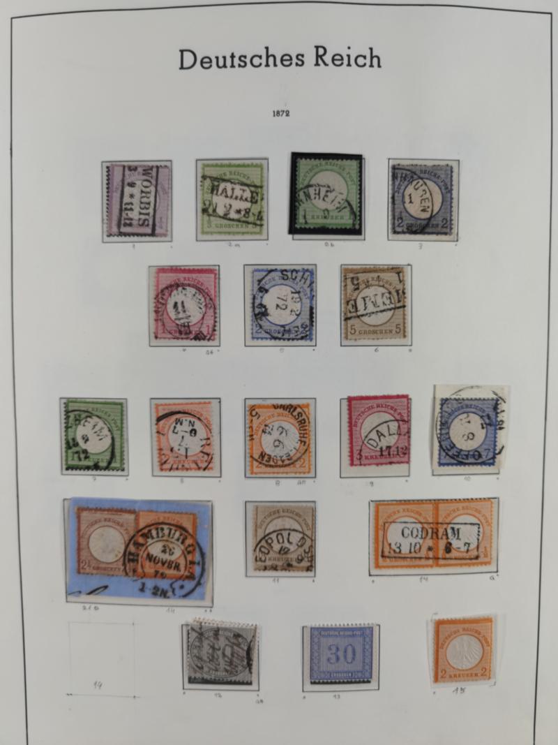 1872/1945, gestempelte reichhaltige Sammlung in 3 Bänden, vor 1900 stark spezialisiert mit Stempelbesonderheiten, Plattenfehlern, Farben, Einheiten, etc., danach u.a. Mi. 66 I, Infla mit besseren Farben, alle Zeppeline, etc. Die Erhaltung ist sehr unterschiedlich, aber viel schönes und sauberes Material dabei. Vieles geprüft, einige Befunde und ein Attest.