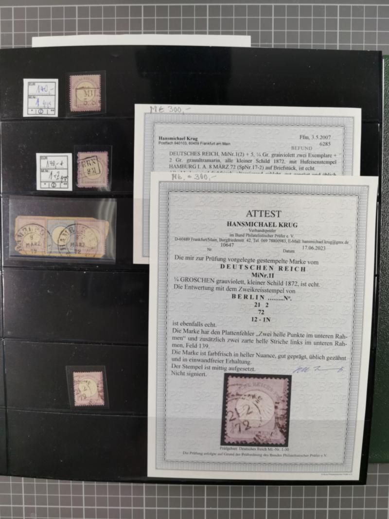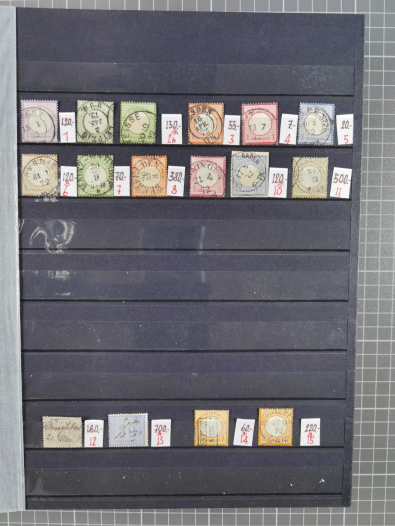 1872/75, gestempelte reichhaltige Sammlung mit etwa 180 Marken/Briefstücken und ca. 40 Briefen, dabei Plattenfehler, seltene Stempel, Einheiten, Erst- und Letzttagsstempel, Mi. 1 auf Ortsbrief, 6 auf Postvorschuss-Paketbegleitbrief, 8 auf Drucksache nach Italien, etc. 13 Atteste und 88 Befunde/Kurzbefunde,