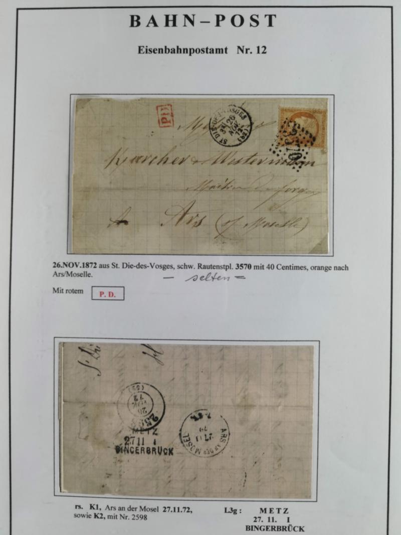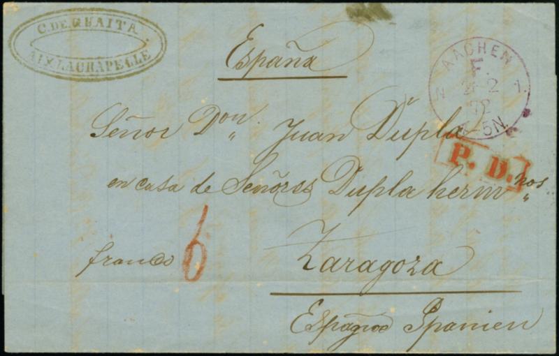 "AACHEN F. N1 26.2.72" recht klar in Violett auf komplettem Faltbrief bis 15 g mit rotem Handstempel "P.D." und Rötel-Taxe "6" (Groschen) für die bar bezahlte Briefgebühr nach dem nur noch bis 31.5.1872 gültigen Tarif nach Zaragoza, Spanien mit Ankunftsstempel. Der Faltbrief hat leichte Altersspuren, sonst in guter Gesamterhaltung