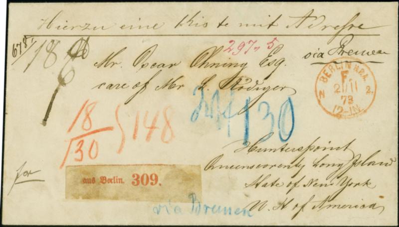 "BERLIN H.P.A. F. N2 21.11.73" in Rot klar auf Paketbegleit-Briefkuvert für eine Kiste mit Leitvermerk "via Bremen" mit Röteltaxe "18/130 = 148" (Groschen) für die bar bezahlte Gebühr (9x 2 Groschen bis Bremen + 130 Groschen für den weiteren Transport) und Blaustift-Weiterfranco-Vermerk "Wf 130" für das Weiterfranco ab Bremen nach Hunterspoint in Bundesstaat New York in guter Gesamterhaltung. Sehr schöner Brief aus dem sogenannten "Württenberger Fund"
