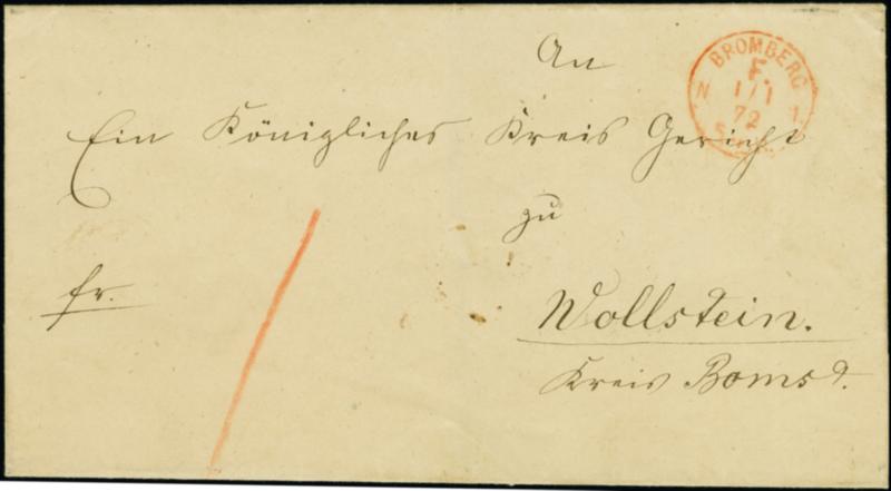 1872, "BROMBERG F. N1 1.1.72" in Rot klar auf Faltbriefhülle bis 15 g nach Wollstein mit Ausgabestempel in einwandfreier Erhaltung, sehr seltener Brief vom ERSTTAG für die Brustschildmarken, wir haben vier Briefe mit Franco-Stempel registriert