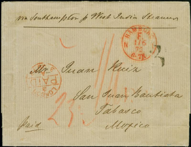 "HAMBURG F N1 1.6.72" in Rot klar auf komplettem Faltbrief der 2. Gewichtsstufe mit Leitvermerk "via Southampton p. West India Steamer" und Rötelvermerk "23 ½" (Groschen) für die bar bezahlte Gebühr bis zum Landungshafen (2x 11 ¾ Groschen) und "1/10" (1 Shilling und 10 Pence) für das britische Weiterfranco via London nach Tabasco, Mexiko mit schwarzem Tax-Stempel "3" (Reales) für den mexikanischen Portoanteil. Der Faltbrief mit typischen senkrechten Faltungen, sonst in guter Gesamterhaltung, interessante und seltener Brief der 2. Gewichtsstufe mit guter Destination Mexiko