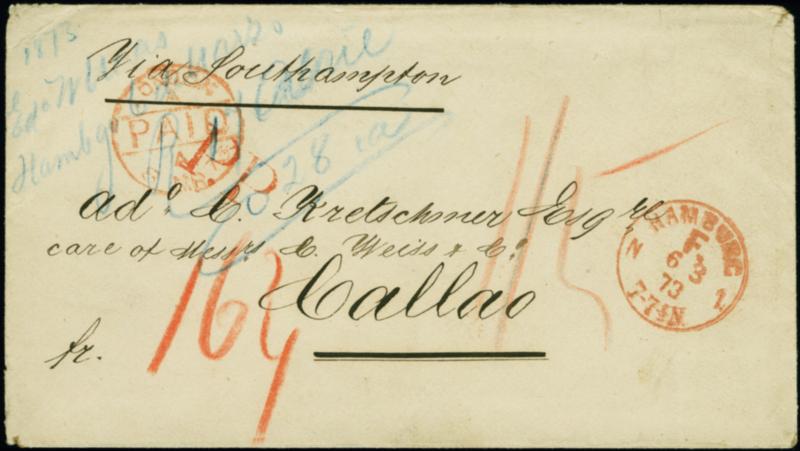 1873, "HAMBURG F. N1 6.3.73" in Rot klar auf Briefkuvert mit handschriftlichem Leitvermerk "via Southampton" mit rotem Handstempel "P.P" via London mit Rötel-Taxen "16 ¾" (Groschen) für die bar bezahlte Briefgebühr und "1/5" (1 Shilling 5 Pence) für das englische Weiterfranco nach Callao, Peru in guter Gesamterhaltung. Interessanter Übersee-Brief mit Destination Peru