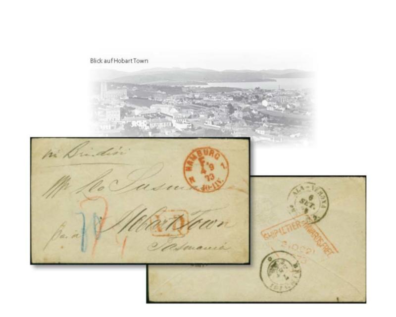 "HAMBURG F. N1 4.9.73" in Rot klar auf kleinformatigem Briefkuvert mit handschriftlichem Leitvermerk "via Brindisi" und Handstempel "P.D" sowie Rötelvermerk "7 ¼" (Groschen) für die bar bezahlte Briefgebühr und blauem Tax-Vermerk "70" (Centesimi) für das italienische Weiterfranco via Brindisi nach Hobert Town, Tasmanien mit rückseitigem Ankunftsstempel und rotem Rhombus-Stempel "SHIP LETTER INWARDS FREE 21.OC.1873" in guter Gesamterhaltung. Ein dekorativer Überseebrief mit sehr seltener Destination Vandiemensland (Tasmanien), Australien
