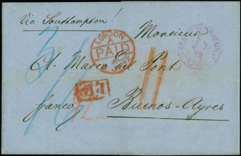 1872, "FRANKFURT A/MAIN F. N2 6.7.72" recht klar in Violett auf komplettem Faltbrief mit handschriftlichem Leitvemerk "Via Southampton" mit rotem Handstempel "P.P" via London mit Rötel-Taxen "42x" (Kreuzer) für die bar bezahlte Briefgebühr und "11" (Pence) für das englische Weiterfranco nach Buenos Aires in guter Gesamterhaltung. Seltener Übersee-Brief aus dem Kreuzer-Bezirk mit Destination Argentinien