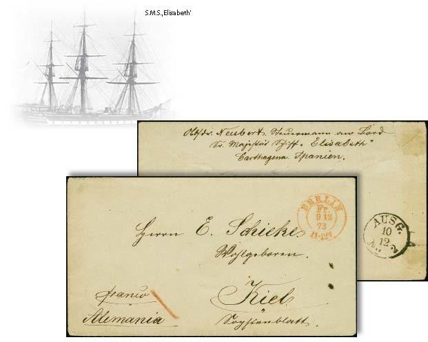 Marine-Schiffspost: Korrespondenz Marineschiff im Auslandseinsatz - Hofpostamt – Heimat: 1873, Franko-Stempel "BERLIN Fr. 9.12.73" in Rot klar auf Briefkuvert mit rückseitigem Absendervermerk "Neubert Steuermann an Bord Sr. Majestät Schiff "Elisabeth" Carthagena Spanien" über das Hofpostamt in Berlin nach Kiel mit Ausgabestempel. Rückseitig fehlt ein kleiner Teil der Verschlussklappe, sonst in guter Gesamterhaltung. Aus der frühen Zeit der Kaiserlichen Marine (Brustschild-Zeit) sind nur ganz wenige Briefe von Marineangehörigen auf hoher See in die Heimat bekannt, eine Marineschiffspost-Seltenheit. Die S.M.S. Elisabeth wurde 1868 auf der Königlichen Werft in Danzig gebaut. In der zweiten Hälfte des Jahres 1873 war sie Teil des deutschen Geschwaders vor der spanischen Küste, wo sie u. a. die Seeschlacht vor Cartagena beobachtete. Das Porto für Briefe von Matrosen im Mannschaftsdienstgrad in die Heimat betrug 1 Gr., wurde an Bord eingezogen und später mit dem Marine-Post-Büro in Berlin abgerechnet. Die Briefe wurden unfrankiert in Sammelumschlägen (Hofpostamtsumschläge) bei nächster Postübernahmemöglichkeit an das Marine-Post-Büro beim Hofpostamt in Berlin gesandt. Dort wurden die einzelnen Briefe mit dem roten DKr.-Franco-Stempel und der Röteltaxe "1" als bezahlt gekennzeichnet und an die Empfänger weitergeleitet.