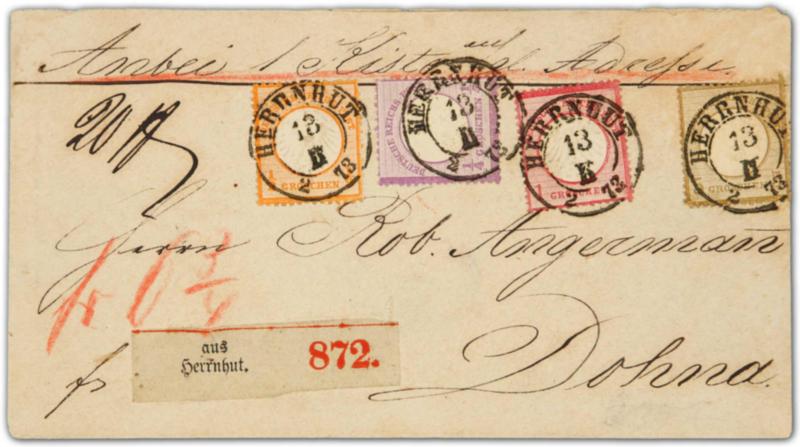 1873, ¼ Gr., ½ Gr., 1 Gr. kl. Brustschild zusammen mit 5 Gr. gr. Brustschild als schöne 4-Farbenfrankatur auf Paketbegleitbrief, aufgegeben "HERRNHUT 13 2 73", adressiert nach Dohna, die Frankatur ist farbfrisch und gut gezähnt, nur der Wert zu 5 Gr. ist etwas an den Rand geklebt und hat unten rechts einige stumpfe Zahnspitzen, sonst gute Qualität (Image)