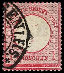 1872, 1 Gr. kleiner Brustschild mit dem markanten Plattenfehler "heller Strich im unteren Rahmen", Teilabschlag des Hufeisenstempels Mülhausen i. Els., die farbfrische und gut geprägte Marke im Format L 16 ist gut gezähnt und bis auf die Dezentrierung nach unten einwandfrei, Fotoattest Sommer BPP (ME 550,-) (Image)