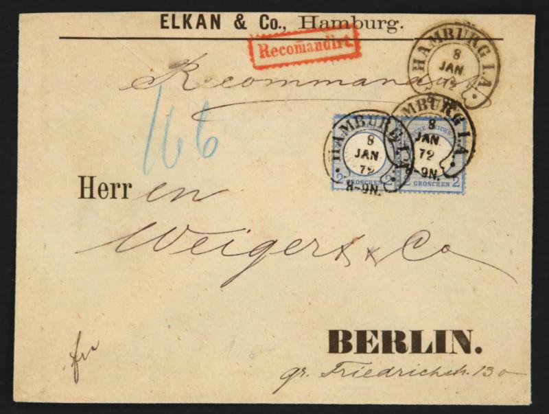 1872, 2 Gr. kl. Brustschild grauultramarin, waager. Paar auf Einschreibbrief, aufgegeben "HAMBURG I.A. 8 JAN. 72", 3 saubere Abschläge des Hufeisenstempels, adressiert nach Berlin, die Frankatur ist farbfrisch und gut gezähnt, der Brief oben etwas verkürzt, sonst gute Qualität (Image)