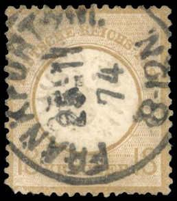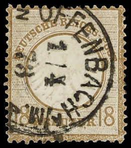1872, 18 Kr. großer Brustschild mit Ekr. "FRANK(FURT A/M.) 16 11 74", farbfrische Marke mit guter Prägung, leichte Rand- und Zahnfehler, Querbug und falzhelle Stelle, unsigniert, echt gebraucht eine seltene Marke, Fotoatteste de Montbas Paris und Jäschke-Lantelme BPP 06/2024 (ME 2.800,-) (Image)