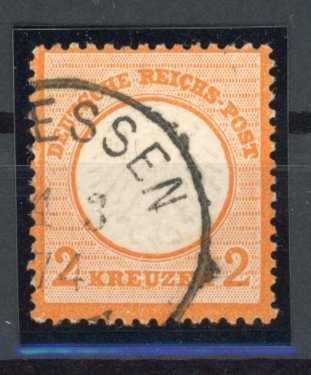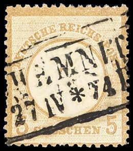 1872, 5 Gr. großer Brustschild ockerbraun mit Schraubenkopfabdruck im Prägefeld, auf dieser Wertstufe selten, gestempelt "CHEMNITZ 27 IV * 74", farbfrische und gut zentrierte Marke, übliche Zähnung mit 2 fehlenden Zähnen und Eckbug, Fotobefund Dr. Zill BPP 02/2025 (Image)