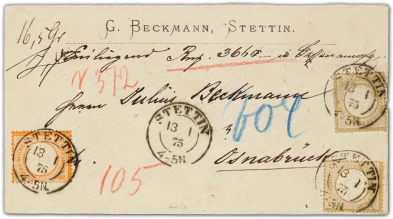1875, ½ Gr. gr. Brustschild orange (waagrerechte Bugspur) und zwei Einzelwerte 5 Gr. gr. Brustschild ockerbraun (ein Wert 3 kurze Zähne) auf Wertbrief, aufgegeben "STETTIN 13 I 75" (verwendet in der Pfennig-Zeit), adressiert nach Osnabrück, die Frankatur ist farbfrisch und üblich gezähnt, rückseitig mit Ankunftsstp. vom 14.1.75, insges. gute Bedarfsqualität (Image)