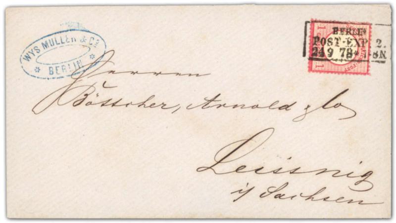 1872, 1 Gr. gr. Brustschild, karmin mit dem Plattenfehler III "tropfenförmiger Punkt hinter GROSCHEN", als portogerechte EF auf Fernbrief, aufgegeben "BERLIN POST-EXP. 2 24.9.73", adressiert nach Leisnig/Sachsen, hervorragend geprägt, gut zentriert und gut gezähnt, Fotoattest Sommer BPP (ME 1.000,-) (Image)