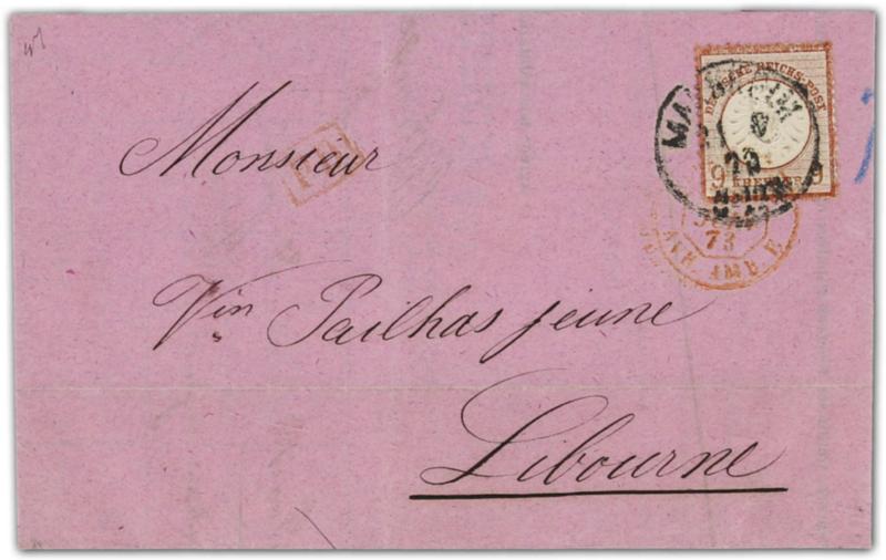 1872, 9 Kr. großer Brustschild mittelrötlichbraun auf Faltbrief ab "MANNHEIM 21 6 73" nach Libourne/Frankreich, gut geprägte Marke mit etwas schütterer Farbe, üblich gezähnt (ME 750,-) (Image)
