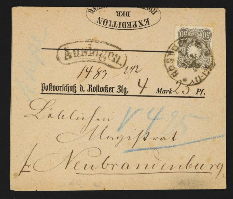 1875, 50 Pfge. grau als Einzelfrankatur auf Postvorschuss-Brief der Rostocker Zeitung in Form eines Streifbandes, aufgegeben "ROSTOCK 25.1.76", adressiert nach Neubrandenburg, die Frankatur ist farbfrisch und üblich gezähnt, Zähnung teils etwas gebräunt, rückseitig Ankunftsstp., gute Bedarfsqualität (Image)