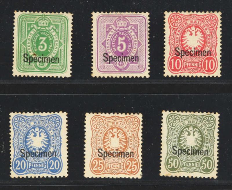1880, 3 bis 50 PFENNIG mit Aufdruck "SPECIMEN" ungebraucht, meist etwas braunfleckig, sonst einwandfrei , sign. Richter (ME 500,-) (Image)