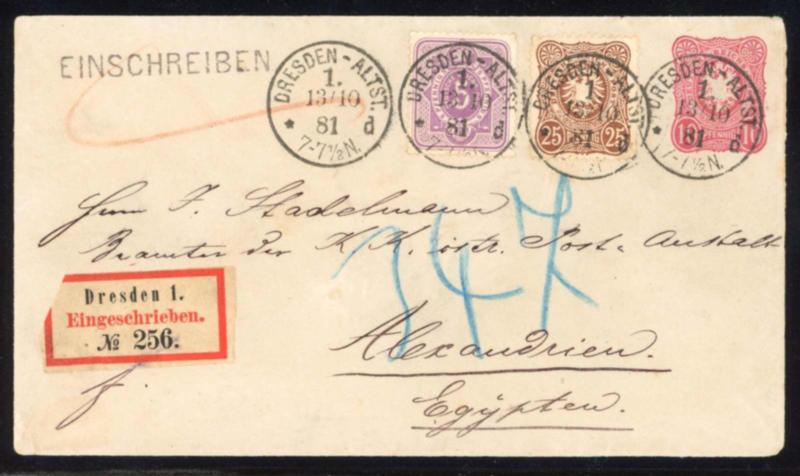 1881, 5 Pfg. violettpurpur und 25 Pfg. lebhaftorangebraun der Pfennig-Ausgabe als Zusatzfrankatur auf 10 Pfg. Ganzsachenumschlag als portogerechter Einschreibbrief, aufgegeben "DRESDEN-ALTST. 1. 13/10.81", adressiert nach Alexandria/Egypten, rückseitig Ankunftsstp. vom 20.10.81, seltene Destination, Marken Bedarfszähnung, insgesamt gute Qualität (Image)