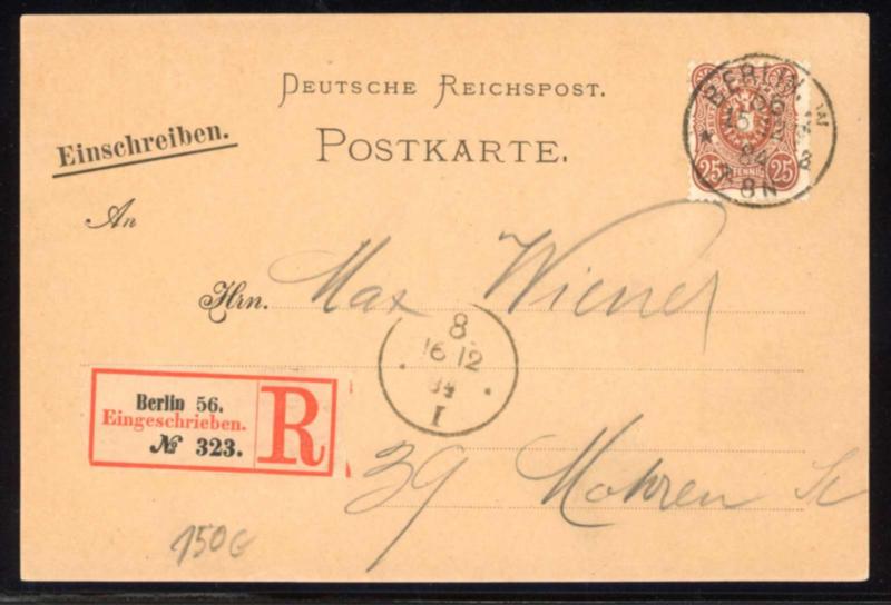1884, 25 Pfg. Reichsadler im Oval rotbraun, portogerechte EF auf Einschreiben-Ortspostkarte, aufgegeben "BERLIN W 56 15.12.84", adressiert in die Mohrenstraße, einwandfrei (Image)