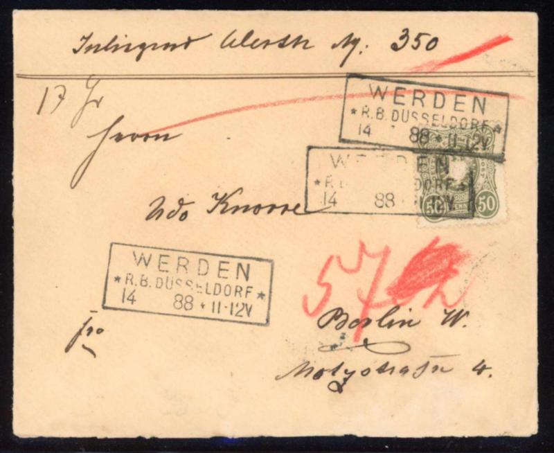 1888, 50 Pfg. der Ausg. Pfennig als Einzelfr. auf portogerechtem Wertbrief, aufgegeben "WERDEN R.B. DÜSSELDORF 14 88" (ohne Monatstype), adressiert nach Berlin, saubere Qualität (Image)