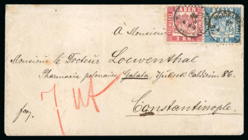 1871 (Jan 30) envelope addressed to Pharmacie polonaise, Constantinople franked 1868 3Kr and 7Kr tied Heidelberg cds, red manuscript "7" charge, reverse with Wien transit of same date and Constantinopel arrival of Austrian Post Office, small tear to envelope under 3Kr, some slight ageing, a scarce destination at this time. Brettl handstamp. Ex Cihangir, lot 992 (Image)