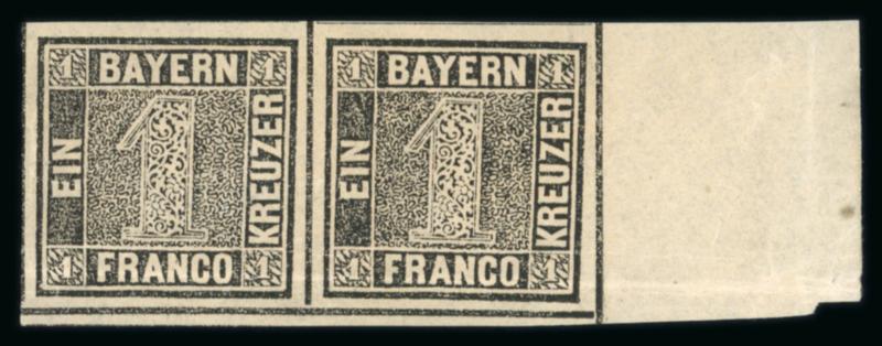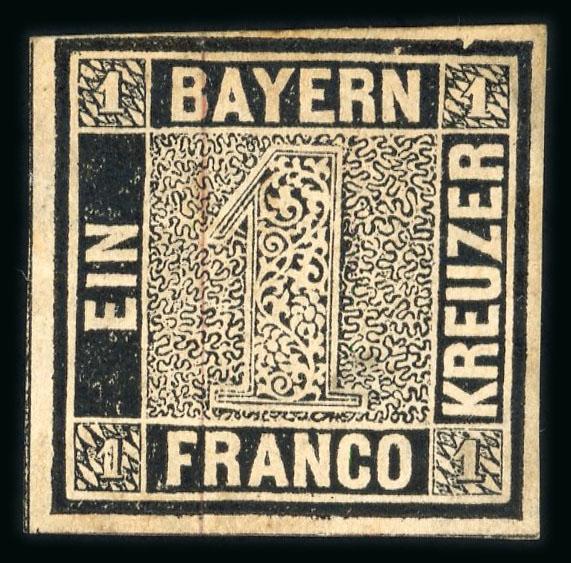1849 1Kr black proof with red silk thread, unused with original gum, close to large margins and deep colour, some minor gum toning, very rare with only one sheet printed and much rarer than the other existing proofs especially in this quality. The Bavarian number one was later printed in the same colour but without a silk thread, although they were added to the next Bavarian stamps. An interesting showpiece; certificate Stegmüller (2019). (Image)