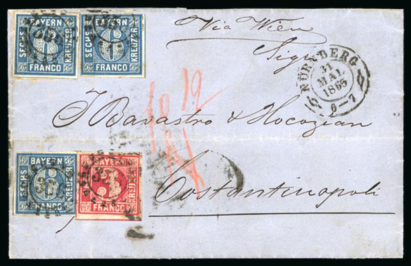 1862 (31 May) outer letter sheet to Constantinopoli franked with 1862 3Kr and three 6Kr cancelled 356 Muhlradstempel with Nurnberg date stamp in association, endorsed Via Wien at top, reverse with Wien transit 1/6 and arrival cds 6/6. An underfranked cover as mail via Vienna was charged at 23Kr (9 + 14), here the red manuscript "12" charge is an error. The right hand 6Kr with touched margin, others good to large, some hinge reinforcement to top fold. A very unusual underfranked cover to a rare destination at this date. M Brettl Cert (2014) (Image)