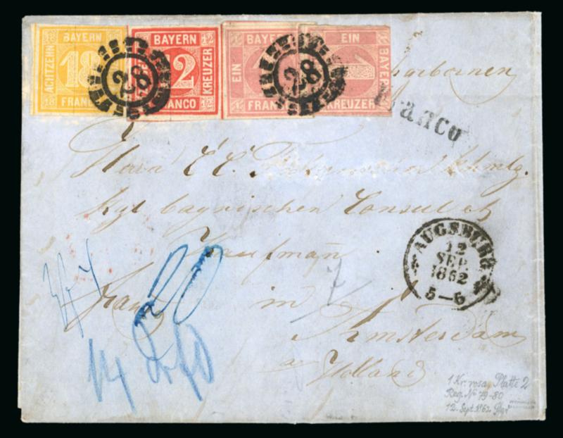 1862, 1 Kr rose from the rare plate 2 (showing sharp corners), two singles together with 12 Kr red and 18 Kr yellow, tied by ”28” numeral and AUGSBURG 12 SEP 1862 cds alongside on entire letter to Amsterdam, Netherlands. The stamps shows some smaller faults. The 32 Kreuzer franking paid the double rate to the Netherlands. It is unique and represents one of the most important usages of the rare 1 Kreuzer rose, plate 2; certificate Stegmüller BPP (2021): ”In Verbindung mit der 1 Kreuzer (Platte 2) handelt es sich um eine äusserst seltene Dreifarbenfrankatur. Mit der vorliegenden Kombination ist mir kein weiteres Ganzstück bekannt”. (Image)