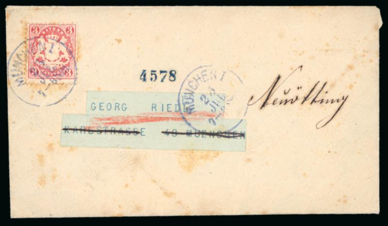 1870 Coat of Arms issue perforated 3 kreuzer rose, fresh colours and well perforated with neatly placed violet-blue single-circle postmark "MÜNCHEN 23 JUL" (1873) on complete telegram with text from Lübeck to Munich and forwarded to Neuötting with transit and arrival postmarks on the back. Slightly stained, especially in the perforation area and that inconspicuous bend mark. Telegrams franked with the coat of arms issue are many times rarer than those with the square issue, only five are recorded. As a franked telegram with complete contents it is unique. Certificate Brettl BPP (2007): ”als frankiertes Telegram mit vollständigen Inhalt ist dies das mir bisher einzig bekannte Exemplar”. (Image)