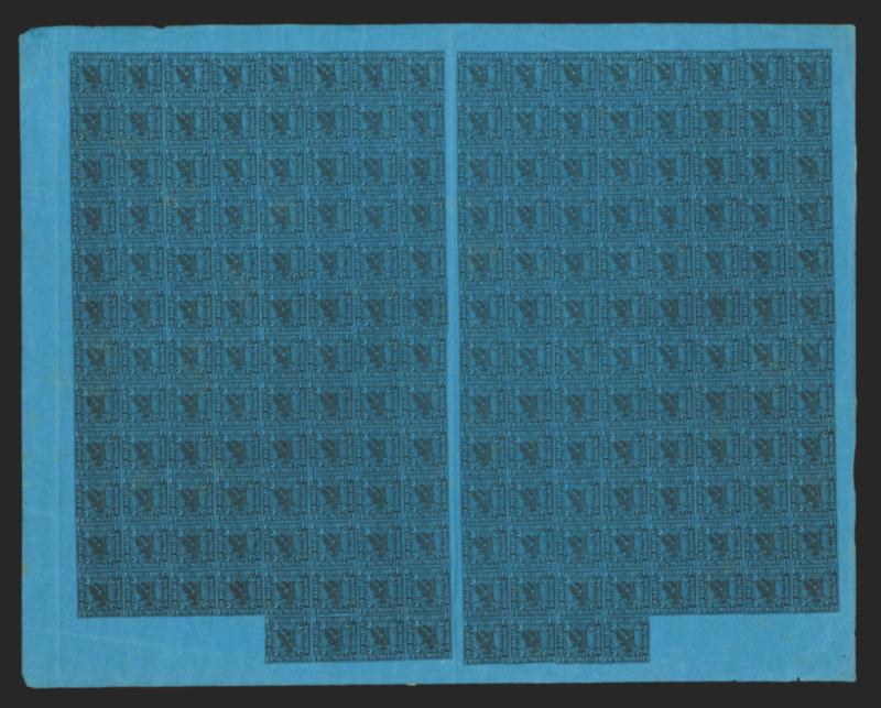1861 1/2s black on blue complete mint sheet of 200, as to be expected from a multiple of this size, there are small stains on the gum and some fold residues, as well as folded in the middle and minimally separated at the bottom, the Jakubek cert. points out the freshness and rarity, being one of only three known complete sheets from 1867. A great rarity of Bergedorf and German States, as complete sheets of first issue stamps are hardly available.