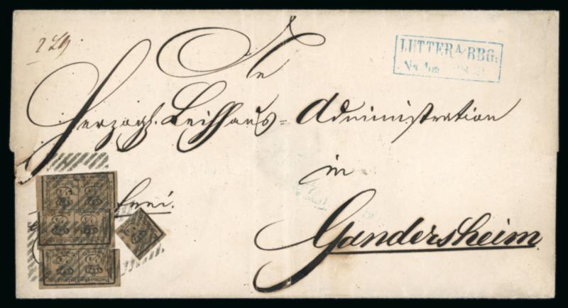 1857 4/4 Ggr black on yellow-brown, rare franking of three pairs of 1/4 and a single 1/4, three have slightly touched margins and the rest very well margined, tied by barred numeral 32, with LUTTER A/BBG alongside, on lettersheet to Gandersheim; a very rare 7/4 Ggr franking on double weight domestic mail. (Image)