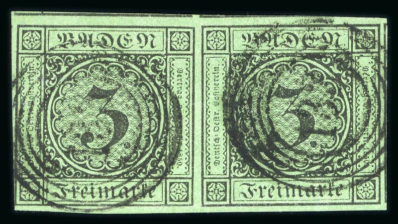 1853 3kr black on green pair with very wide margins except for just touching bottom left, showing parts of adjoining stamps at top and right, obliterated by circular numeral cancellation, very fresh and attractive; signed Pfenninger. (Image)