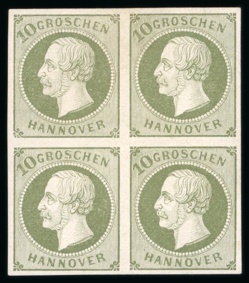 1861 10gr dark olive-green, block of four in exceptionally fresh quality, wide margins on all sides, and with full original gum, upper stamps with hinge remnant and the lower pair with a tiny trace of hinge; minor gum bends, an outstanding and scarce multiple; cert. Berger (2014). (Image)