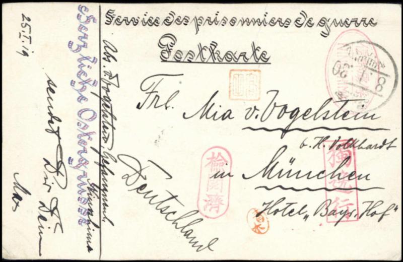 1919, Ninoshima, schöne Postkarte mit kolorierter Tuschfederzeichnung nach München(Image 1)