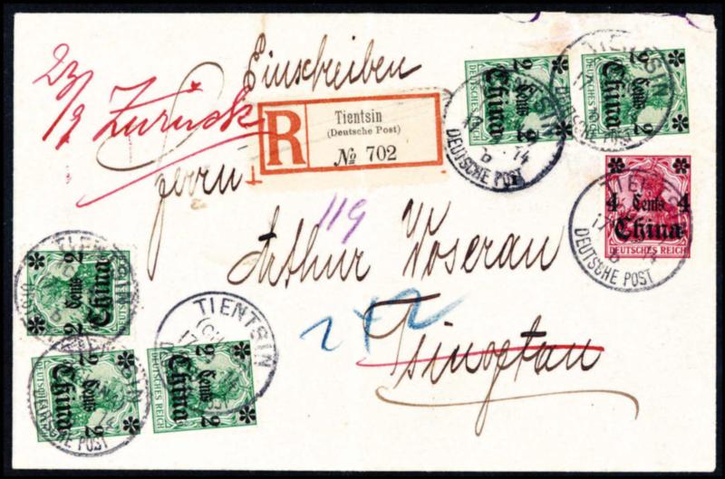 Unzulässiger Einschreibebrief nach Tsingtau: TIENTSIN "b" 17/9 14, auf gef. Einschreibebrief Dt.Post China fünfmal 2 C. und 4 C. nach Tsingtau adressiert (Umschlag gef. und etwas unsauber geöffnet). Aufgrund der Belagerung des Kiautschou-Gebietes durch die Japaner, war ein geordneter Postverkehr nicht mehr gegeben. Aus diesem Grund durften keine nachzuweisenden Sendungen (wie hier Einschreiben) mehr nach Tsingtau befördert werden. Der Brief trägt rs. den amtlichen Vermerk "Einschreibbriefe können nicht befördert werden! (Unterschrift)" des Postamts Tsinanfu mit beiges. Poststempel vom 21.9.14. Der Brief ging nach Tientsin zurück mit Wieder-Eingangsstempel TIENTSIN "b" 24/9 14. Ein in dieser Form einmaliger Brief zur Postgeschichte Kiautschous während des Weltkriegs(Image 1)(Image 2)