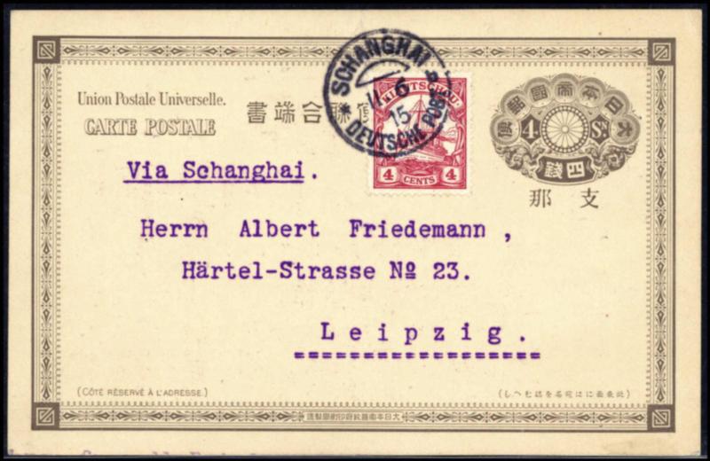 SCHANGHAI "b" 11/6 15, auf phil. Ganzsachenkarte Japan 4 Sn. mit zufrankierter Kiautschou-Schiffsausgabe 4 C. Adressiert an Albert Friedemann nach Leipzig. Rs. datiert "Tsingtau (Seitou) 20. April 1915". Seltene Karte (vgl. Friedemann-Handbuch 1921, S. 260 und AG-Berichte 1971, S. 865). Ex Slg. Fontane(Image 1)(Image)