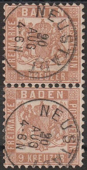 Germania Antichi Stati - Baden. 1862 - 9 k. rosso in coppia verticale n. 15. Cat. 180,00 SPL (Image)