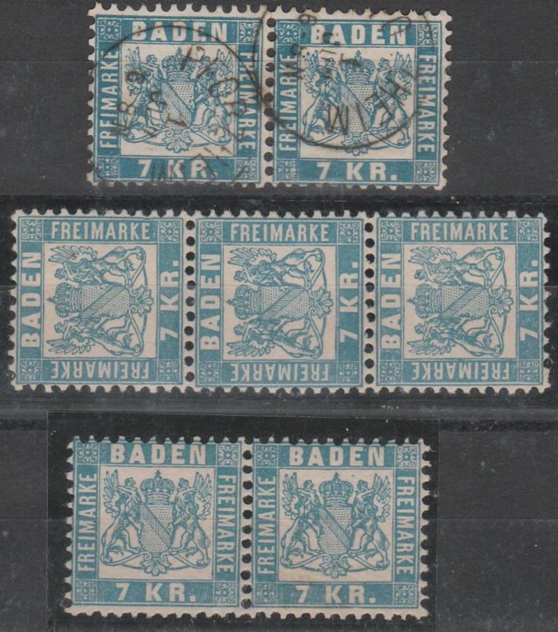 Germania Antichi Stati - Baden. 1868 - 7 k. azzurro una striscia di tre + una coppia nuova + una coppia usata, n. 26. SPL. Cat. € 290,00. SPL (Image)