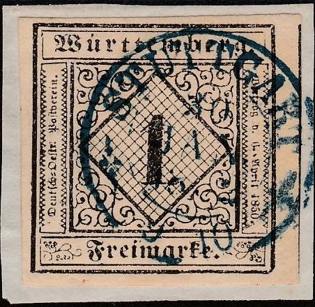 Württemberg. 1851 - 1 k. camoscio su piccolo frammento, annullato a Stoccarda n. 1. Molto bello. Firma E. Diena. Cat. € 180,00 (Image)