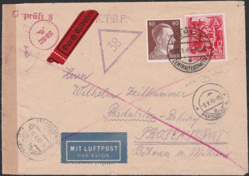 Germania - Storia Postale. 1/5/1945 - Lettera da Berlino per Pardubice, affrancata con 12+38p. “in onore delle S.A. e delle S.S. n. 825 + complementare. Annulli di transito e arrivo al verso. Pregevole affrancatura. Cert. Raybaudi. SPL (Image)