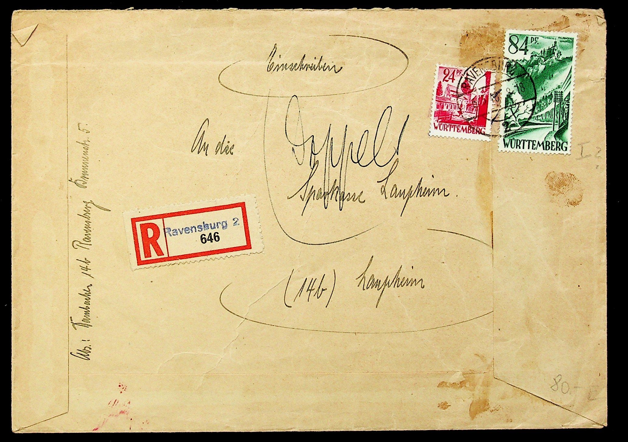 Germany Wurttemberg 1948 2v on Regd reused cover from Ravensburg to Laupheim(Image 1)