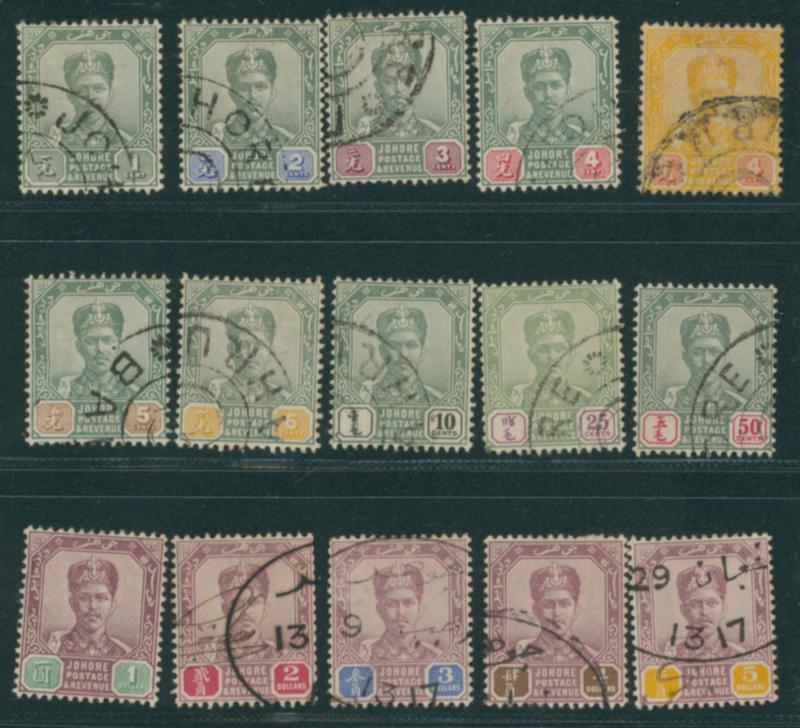Malaysia Johor 1896 - 1899 1c - $1 $2 $3 $4 $5 , 15 stamps hinged, mainly used with some unused, complete, catalog value:110,000YEN (Image1)
