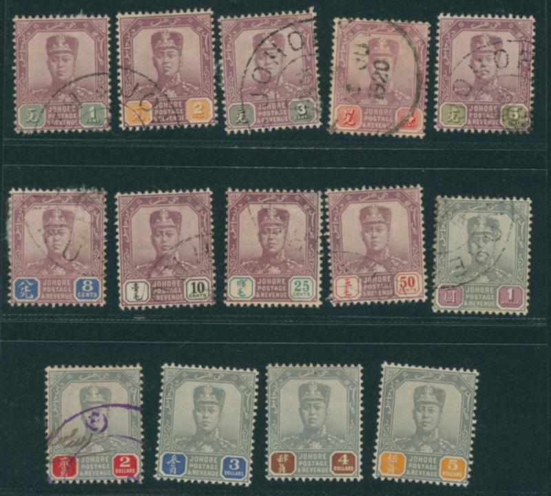 Malaysia Johor , 15 stamps 1904 - 1910 1c - $1 $2 $3 $4 $5 stained, hinged, mainly used with some unused, complete, catalog value:70,000YEN (Image1)