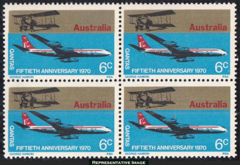 1970 Scott 491-492, 6c Qantas Boeing 707 and Avro 504 and 30c Sunbeam Dyak powered Avro 504 on Ground and Qantas Boeing 707 in the Air Qantas Australian Overseas Airlines. Mint never hinged. (Inv AUS0491S1) (Image)