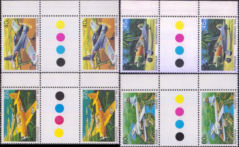 1980 Scott 759-762, 22c Wackett, 40c Winjeel, 45c Boomerang and 60c Nomad Australian Military Training Planes Gutter Pairs. Mint never hinged. (Inv AUS0759S2) (Image)