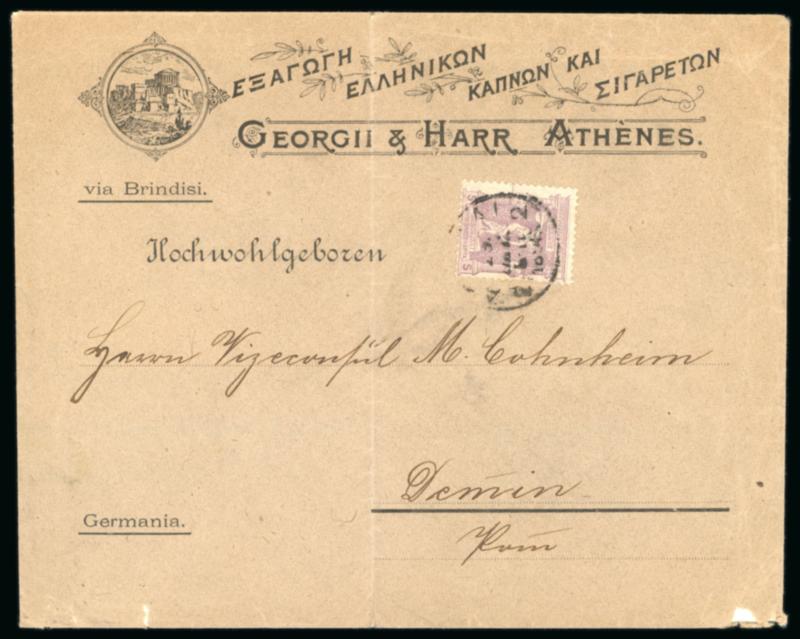 5 Lepta franking: 1898 Tobacco Dealers printed commercial unsealed envelope sent at international printed matter rate with single franking 5l tied indistinct despatch cds, to Germany without arrival, heavy central vertical filing crease, scarce overseas rate. (Image)