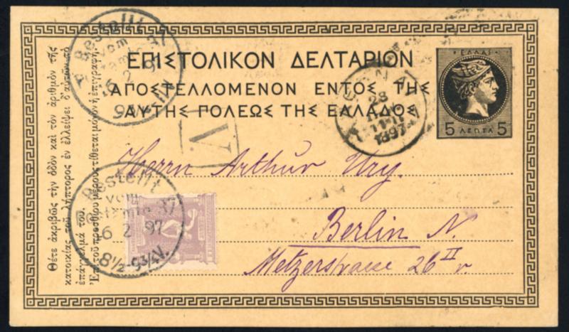 10 Lepta franking: 1897 (9/2) 5 Lepta stationery card, uprated 5 Lepta, Athens despatch cancel tying neither stationary image or stamp, the stamp being cancelled on arrival at Berlin (16/2), fine condition (Image)