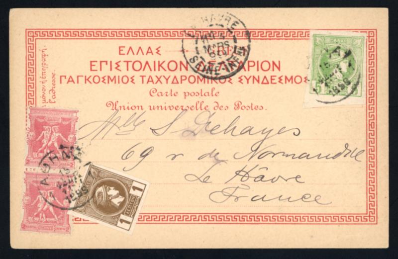 10 Lepta franking: 1899 (19 FE) 5 Lepta postal stationery card uprated with Small Hermes Head 1 Lepta and vertical pair Olympics 2 Lepta tied Patras cds, a fine three issue mixed franking. (Image)