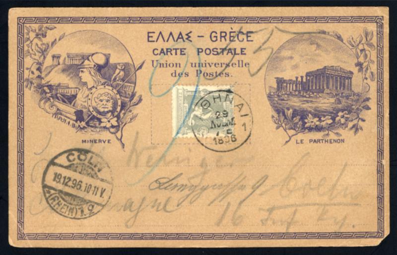 10 Lepta franking: 1896 (29 Nov) 10 Lepta used on an illustrated postcard from Hotel Minerva from Athens to Cologne, arrival cds at left, bottom right corner fault, still an attractive item. (Image)